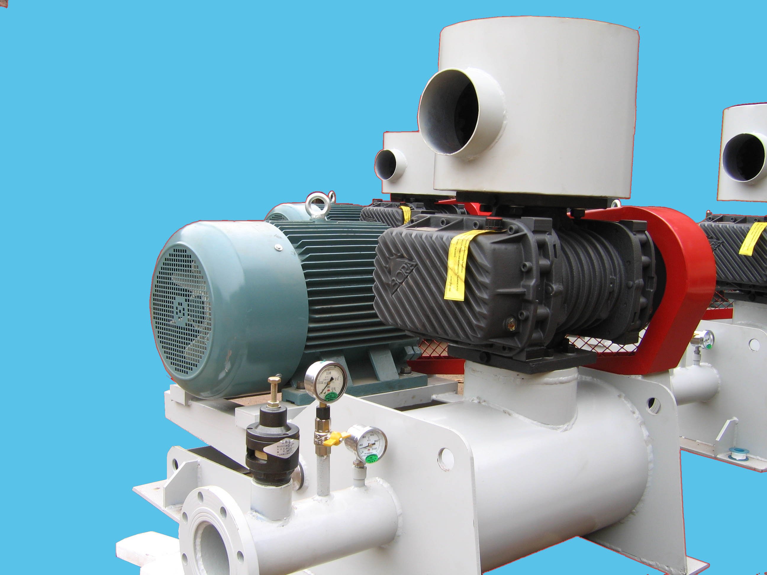 在机壳内部设置有两组,互朝相反方向转动三叶罗茨的转子,转子与转子,及转子与机壳间仅留有极小的间隙。当其中一转子叶端经过吸入口时,具